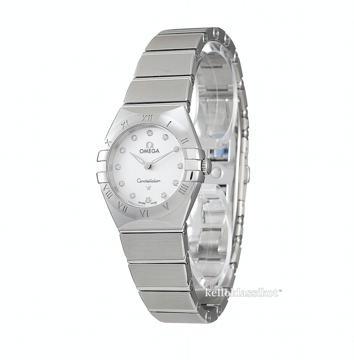 | Kellotaulu: | Valkoinen helmiäinen , timanteilla |